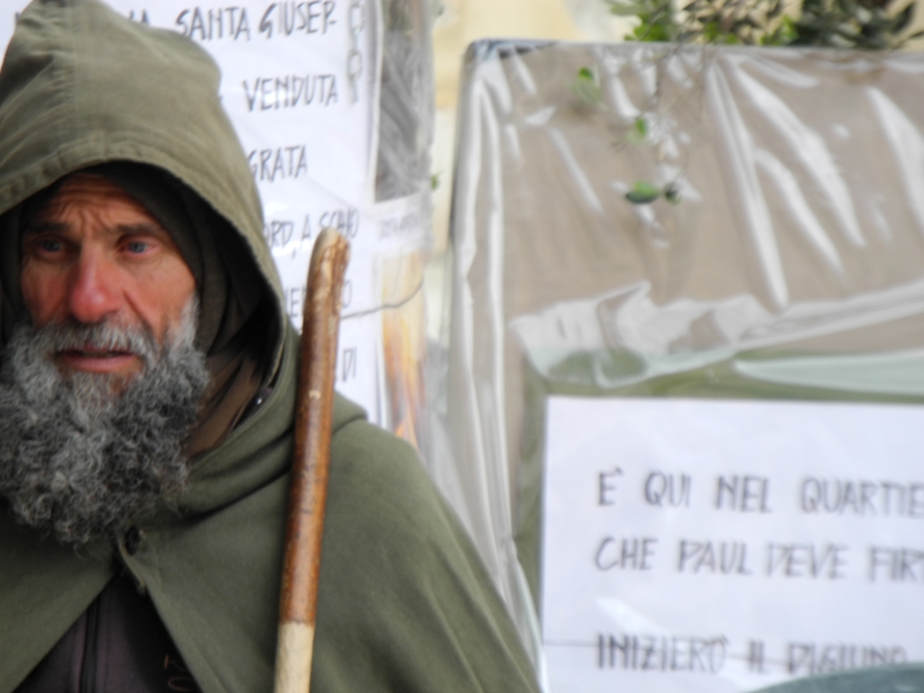Ho sentito di dover fare molta penitenza. Dapprima ho fatto trenta giorni a pane e acqua poi ho voluto rimanere nella grotta perché ho visto che questa società è in sofferenza. Poi ho fatto quaranta giorni solo di acqua, un po’ di miele come Giovanni Battista [ride, ndr] e poi l’Eucarestia, che ogni giorno mi portava don Pino. Ho voluto vivere quello che dice la Parola: chi beve di quest’acqua non avrà mai più sete, chi mangia di questo pane non avrà mai più fame (cfr. Gv 4,5,6). Io sono testimone di tutto ciò. Ho fatto tante volte digiuni e penitenze per dire di non abbandonare i poveri senza casa, senza lavoro, per attirare l’attenzione su di loro.