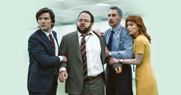 Nella prima stagione il tema sembra essere la separazione netta e assoluta tra vita privata e vita lavorativa. I dipendenti della Lumon – così si chiama l’azienda – vivono tutto ciò in maniera assoluta. Ciascuno di loro infatti è stato assunto dopo essere stato sottoposto alla “scissione”: un intervento neurologico che divide la coscienza in due parti. Una esiste al di fuori del lavoro, ed è ancorata all’identità dei singoli individui prima del loro ingresso in azienda, mentre l’altra esiste solo all’interno ed è come se fosse neonata, pur mantenendo il linguaggio e le capacità cognitive di quando si è adulti. Questo “interno” si risveglia ogni giorno varcando la soglia del posto di lavoro. Lì impara i valori della compagnia e lavora indefessamente per degli obiettivi che non sono chiari né ai dipendenti della Lumon né agli spettatori. Gli impiegati raggruppano per tutto il giorno dei numeri che appaiono sugli schermi dei loro computer e li gettano in cestini virtuali. Lo fanno grazie a delle emozioni che i numeri suscitano senza che nessuno sappia cosa rappresentino e perché abbiano quell’effetto.